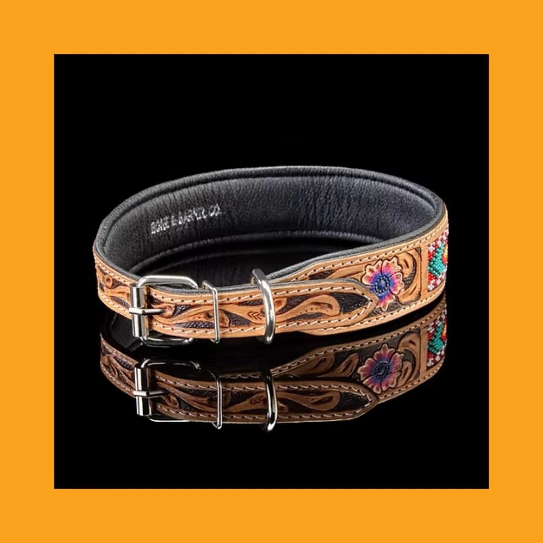 The saddle leather dog collar is adorned with colorful beading and carved violet blossoms. Completing the set is a matching 5ft leash crafted from tooled saddle leather and painted with the same vibrant violet blossoms.