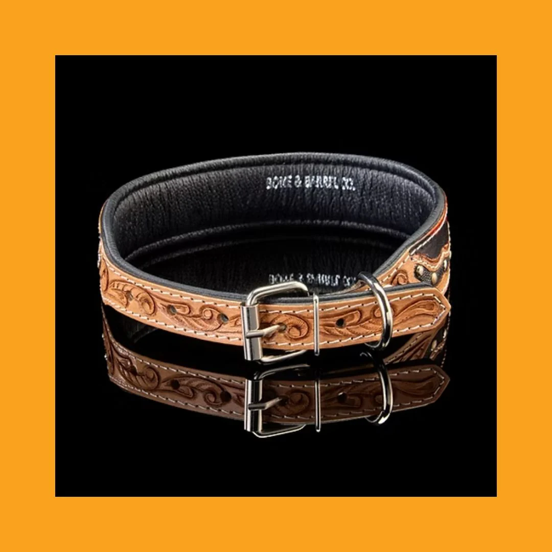 Deep reds collide with light and dark leather creating a unique design accented by studs and rhinestones. Beautiful, hand-tooled saddle leather on the buckle. Paired with a custom, matching 5 foot leash.
